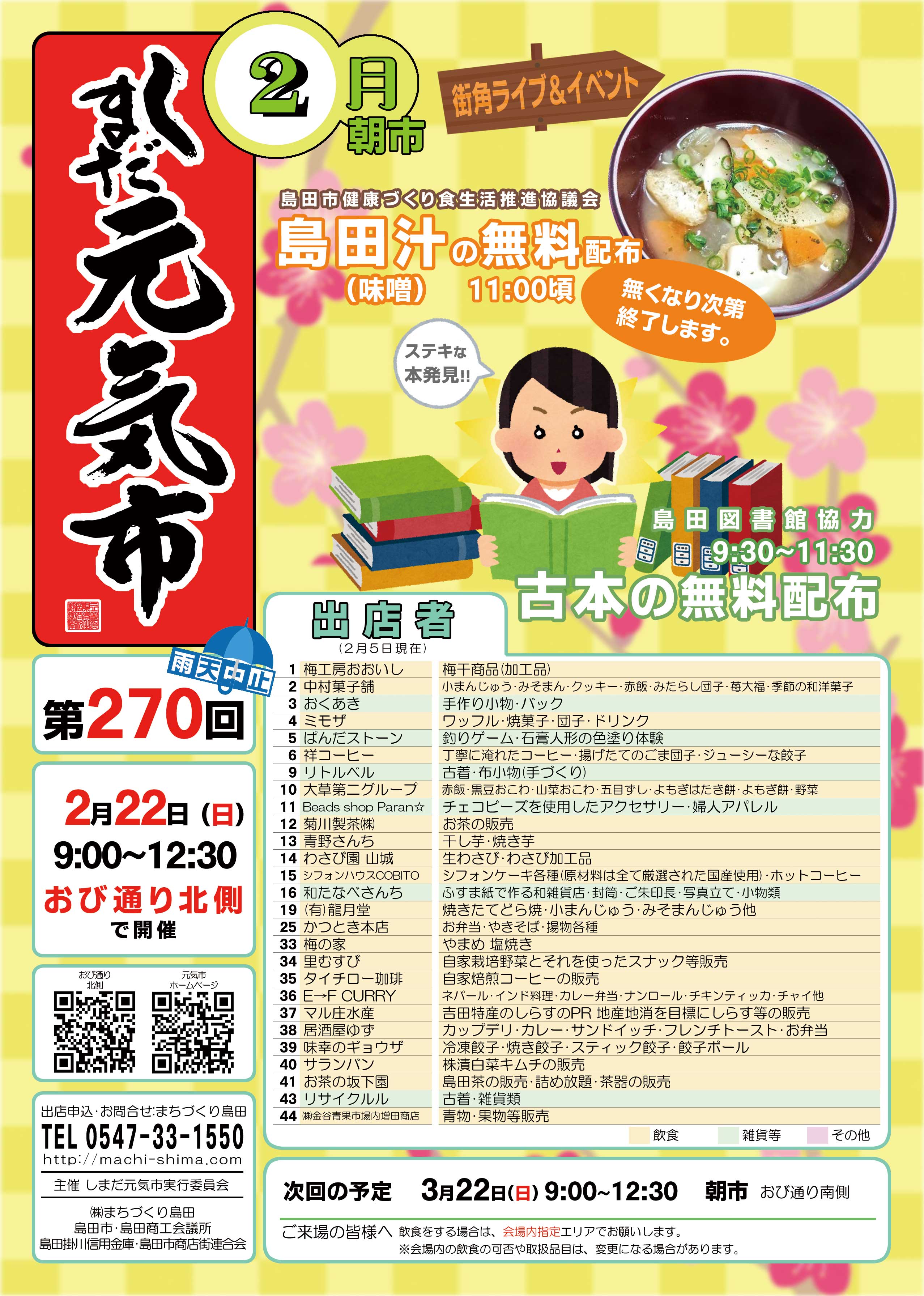 2月の「しまだ元気市」は22日(日)おび通り北側で朝9時から12時30分まで開催する予定です。