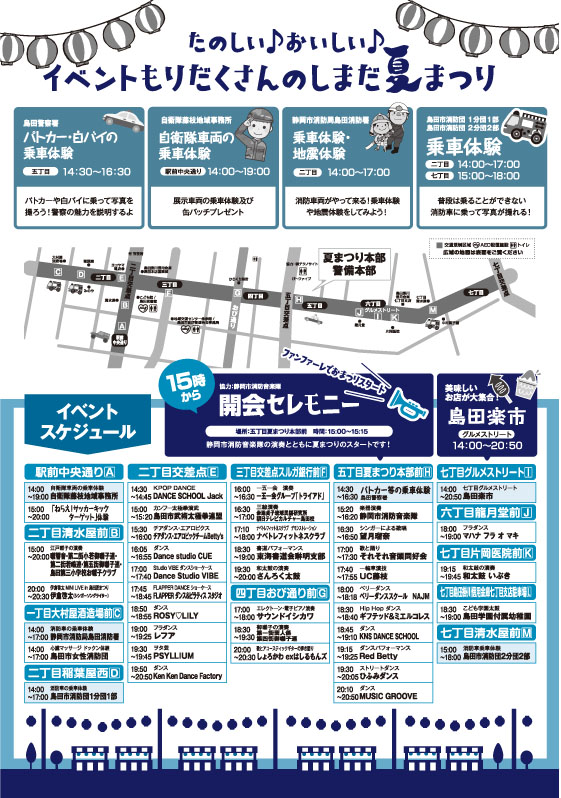 本日開催!8月3日(日)しまだ夏まつり 2025年8月2日 お知らせkanri 本日、夏まつり開催します。 イベント:14時~20時50分 ※交通規制が14時~21時30分になります。 お車で来られる際は交通規制にお気を付けください。 ※駐車場については島田市役所来庁者用駐車場、第二駐車場、ハローワーク駐車場をご利用ください。またピーファイブ駐車場については満車になりましたら、入口等で待つことが出来ません。そのまま道路を直進していただくこととなります。ご了承ください。 また熱中症対策、こまめな水分補給を忘れずにおねがいします。